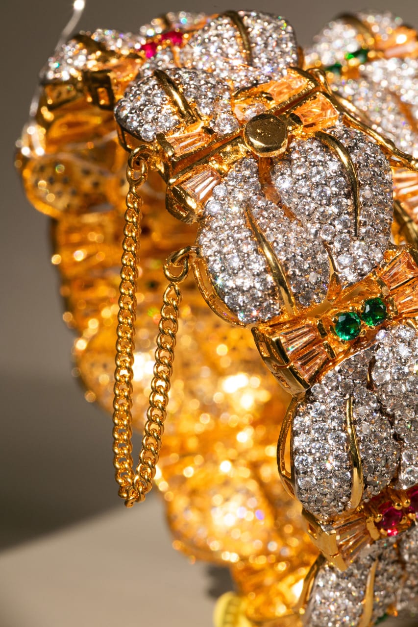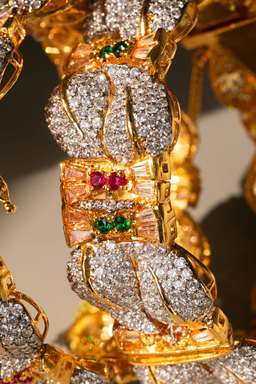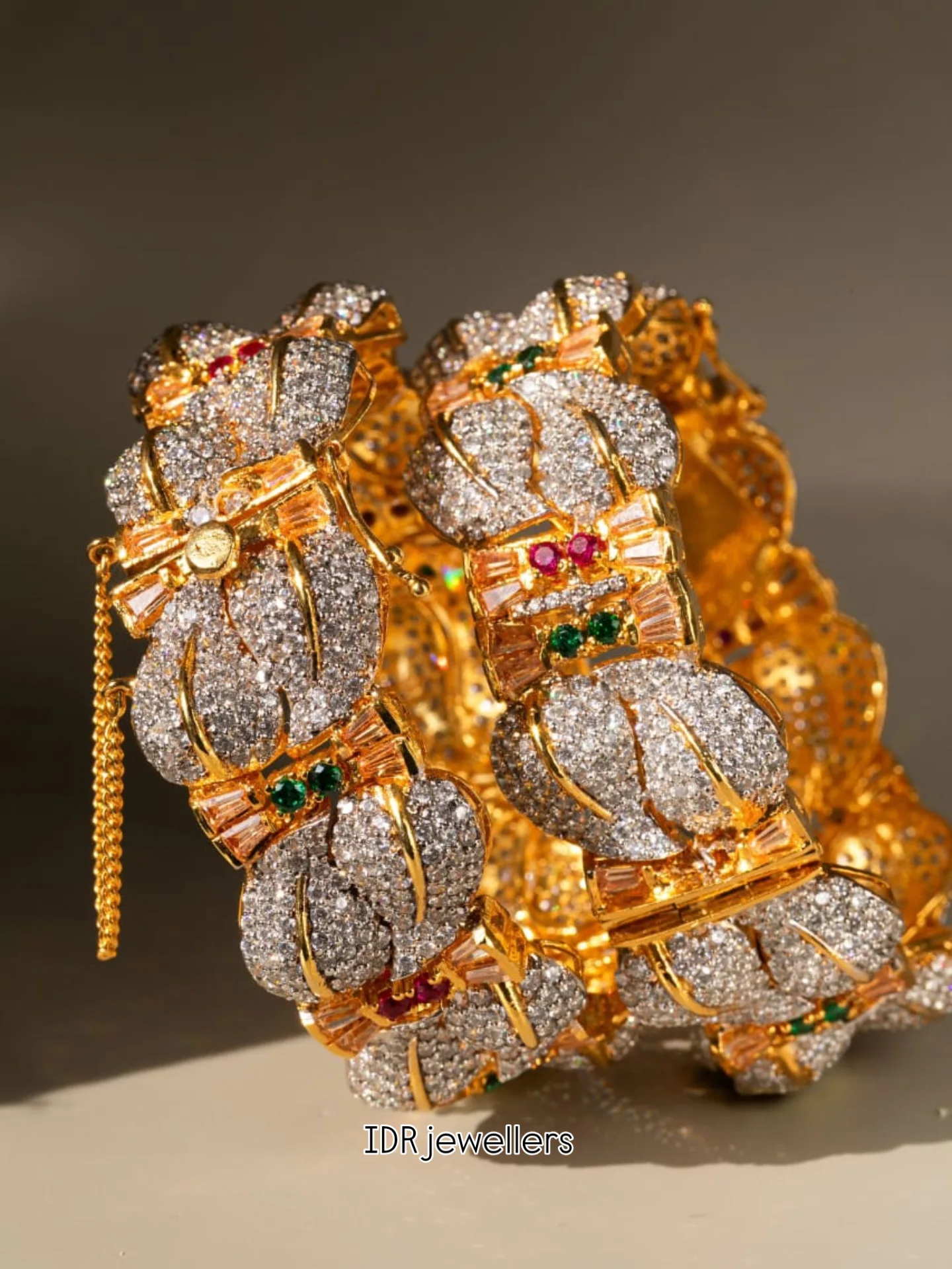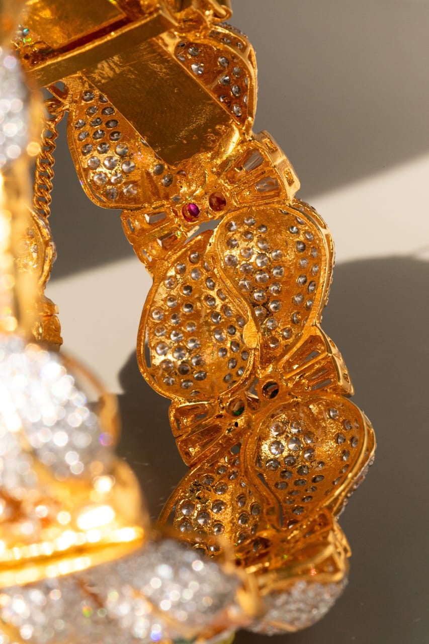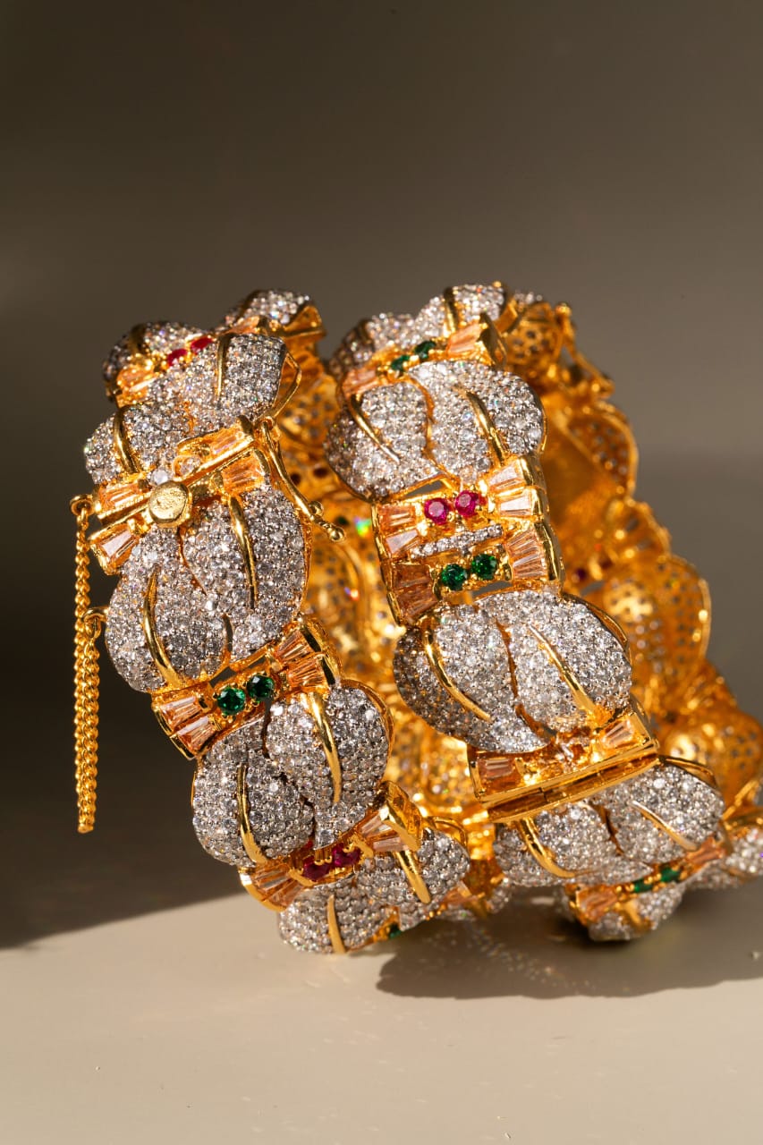 These exquisite bangles are masterfully crafted from 925 sterling silver, weighing 110.500 grams, and finished with a rich gold polish for a regal look. The design features bold floral patterns encrusted with shimmering white stones, enhanced by baguette-cut accents and delicate ruby-red and emerald-green detailing.