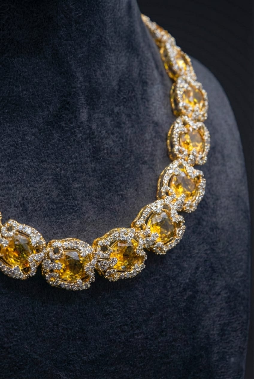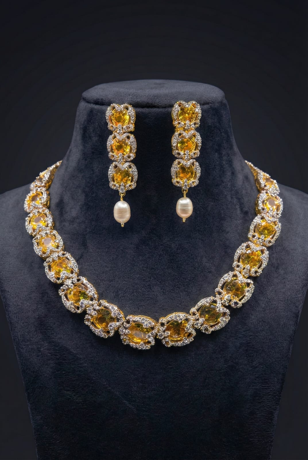 Golden Aurora Luxe Set is a masterpiece of elegance, designed for those who appreciate fine craftsmanship and statement luxury. Made from premium 925 Sterling Silver, this exquisite necklace and earring set showcases luminous golden-toned stones surrounded by finely detailed accents that enhance their brilliance.