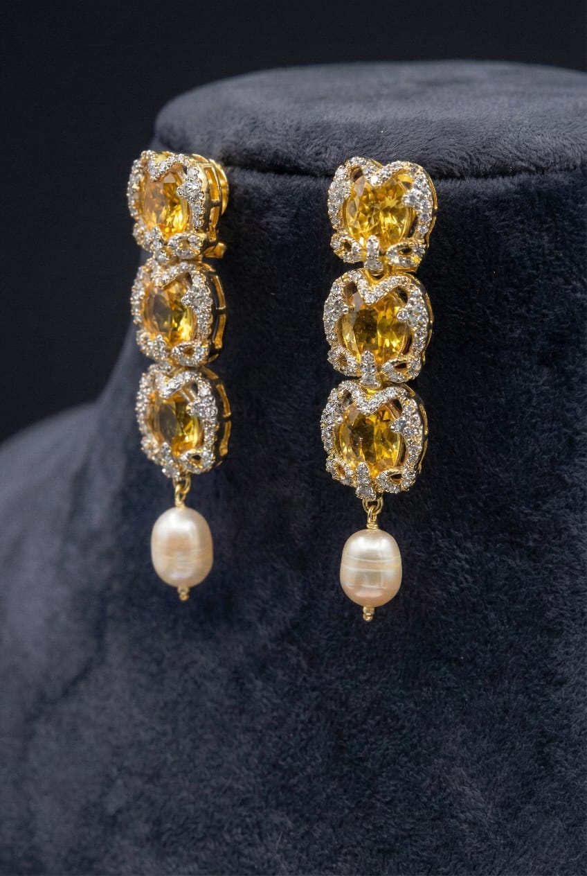 The necklace sits gracefully along the neckline, while the coordinated drop earrings, finished with pearl detailing, add a refined and sophisticated touch. Perfect for bridal wear, formal occasions, and celebratory events, this set blends classic charm with modern luxury.