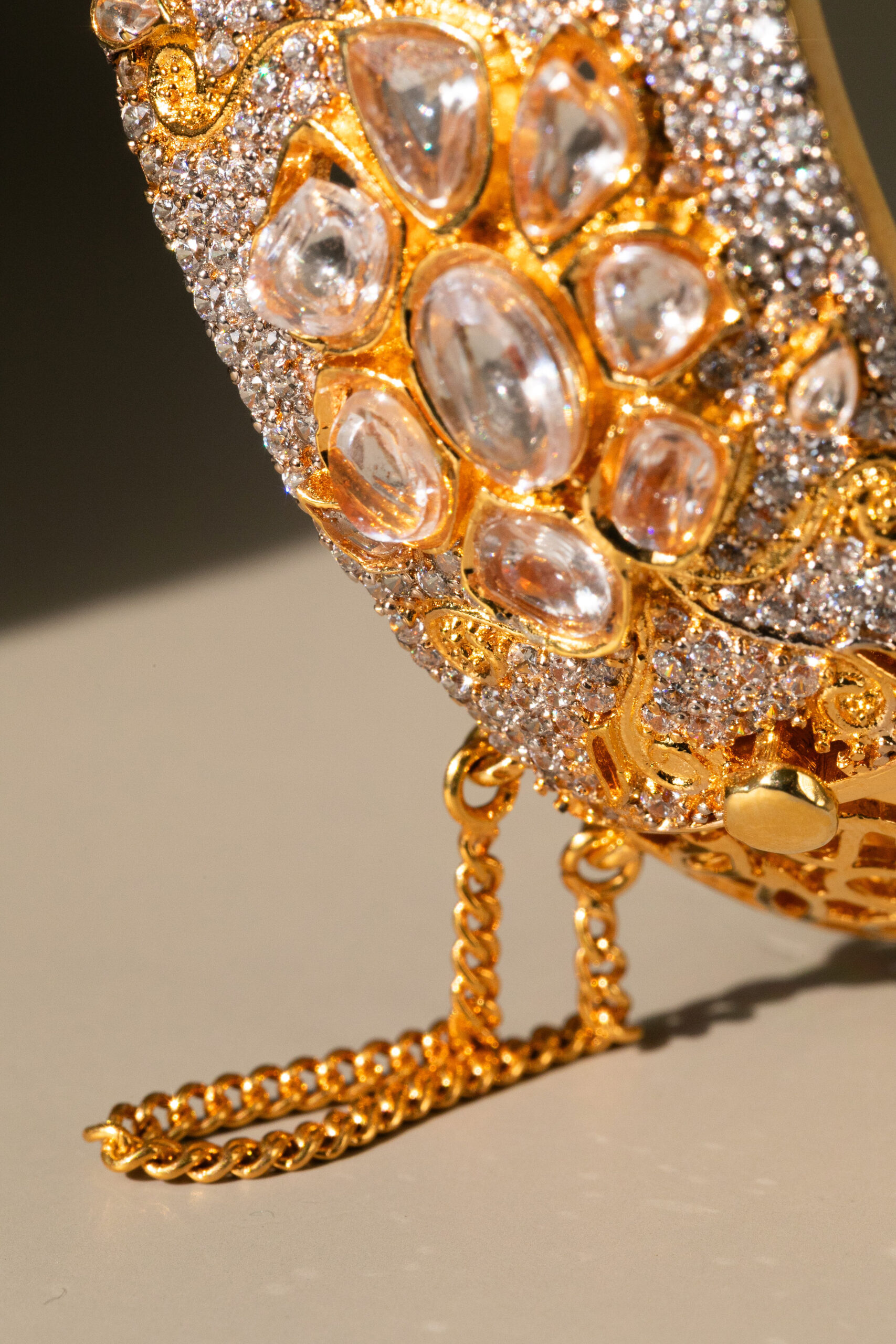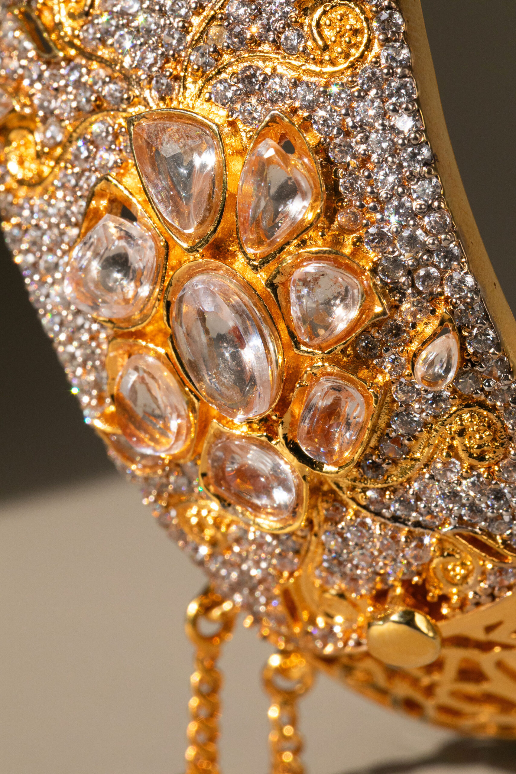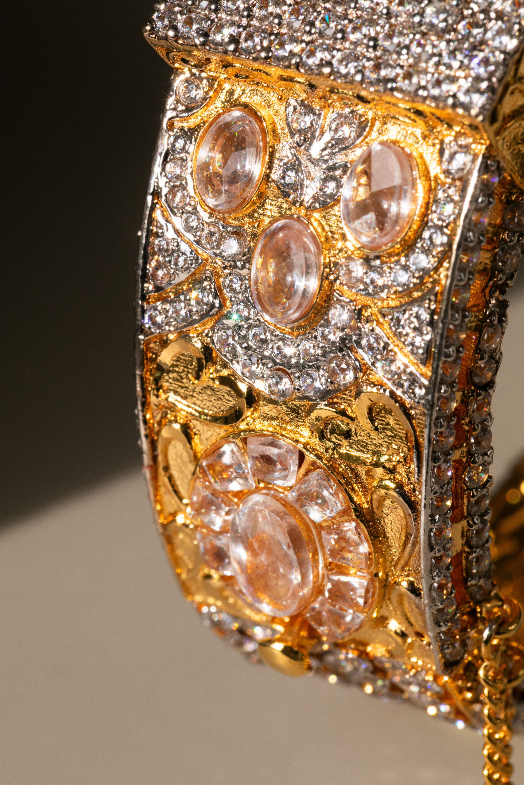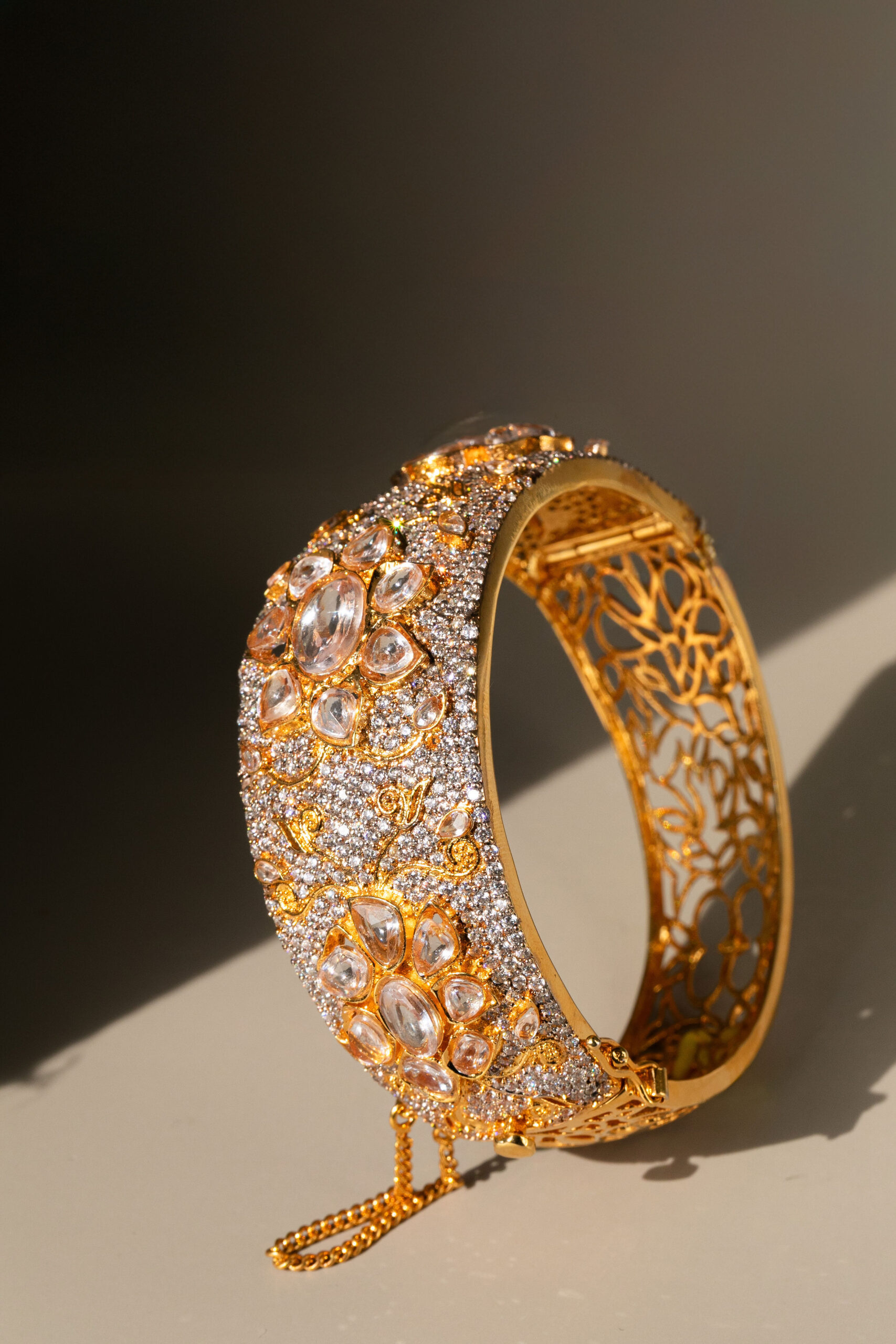 The Nooré Luxe Bangle is a radiant celebration of craftsmanship and elegance. Made from 925 Sterling Silver with a rich gold-plated finish, this statement piece features intricate floral-inspired detailing, shimmering stone embellishments, and a delicately carved inner design. Its luminous sparkle and bold silhouette make it an ideal choice for weddings, festive occasions, and formal ensembles.