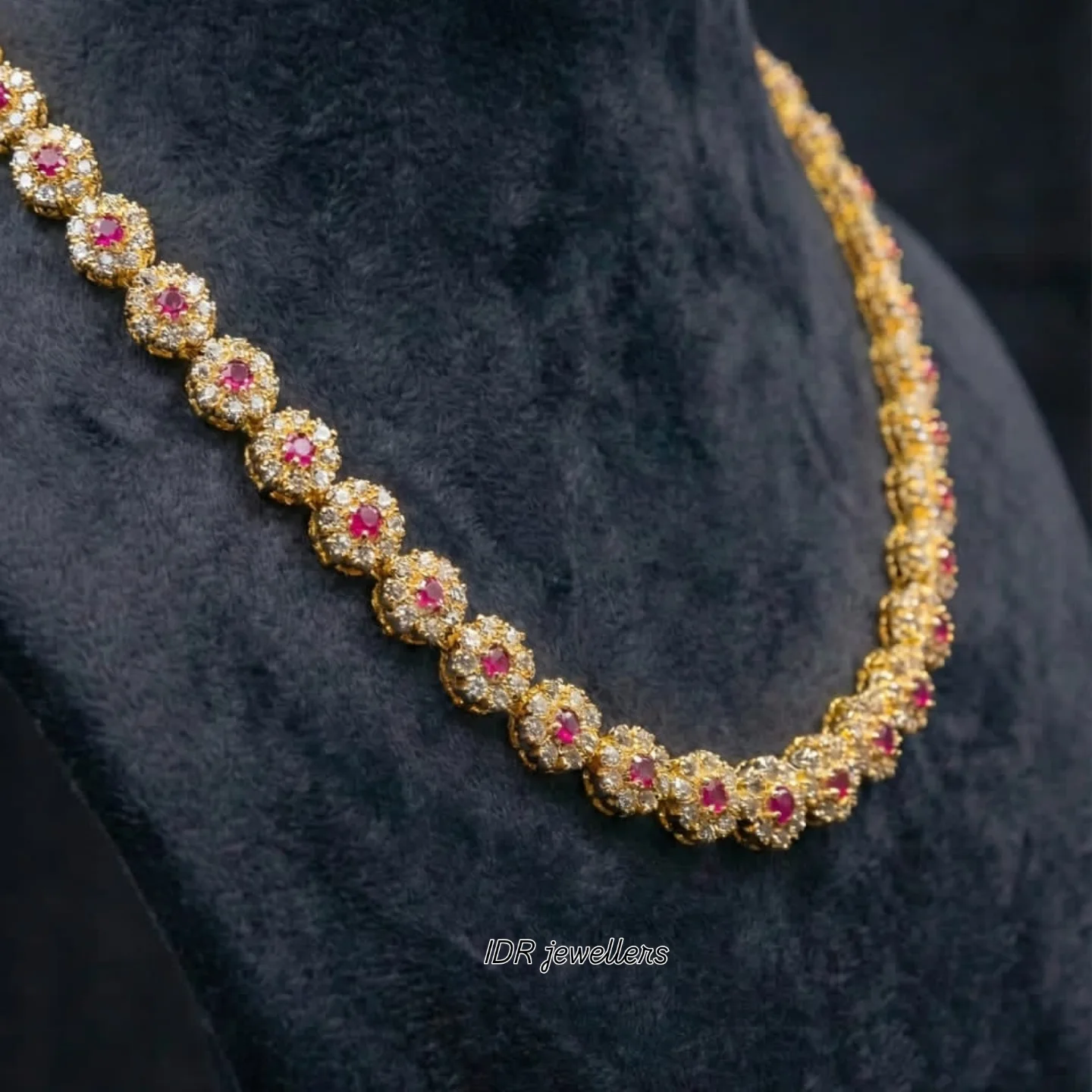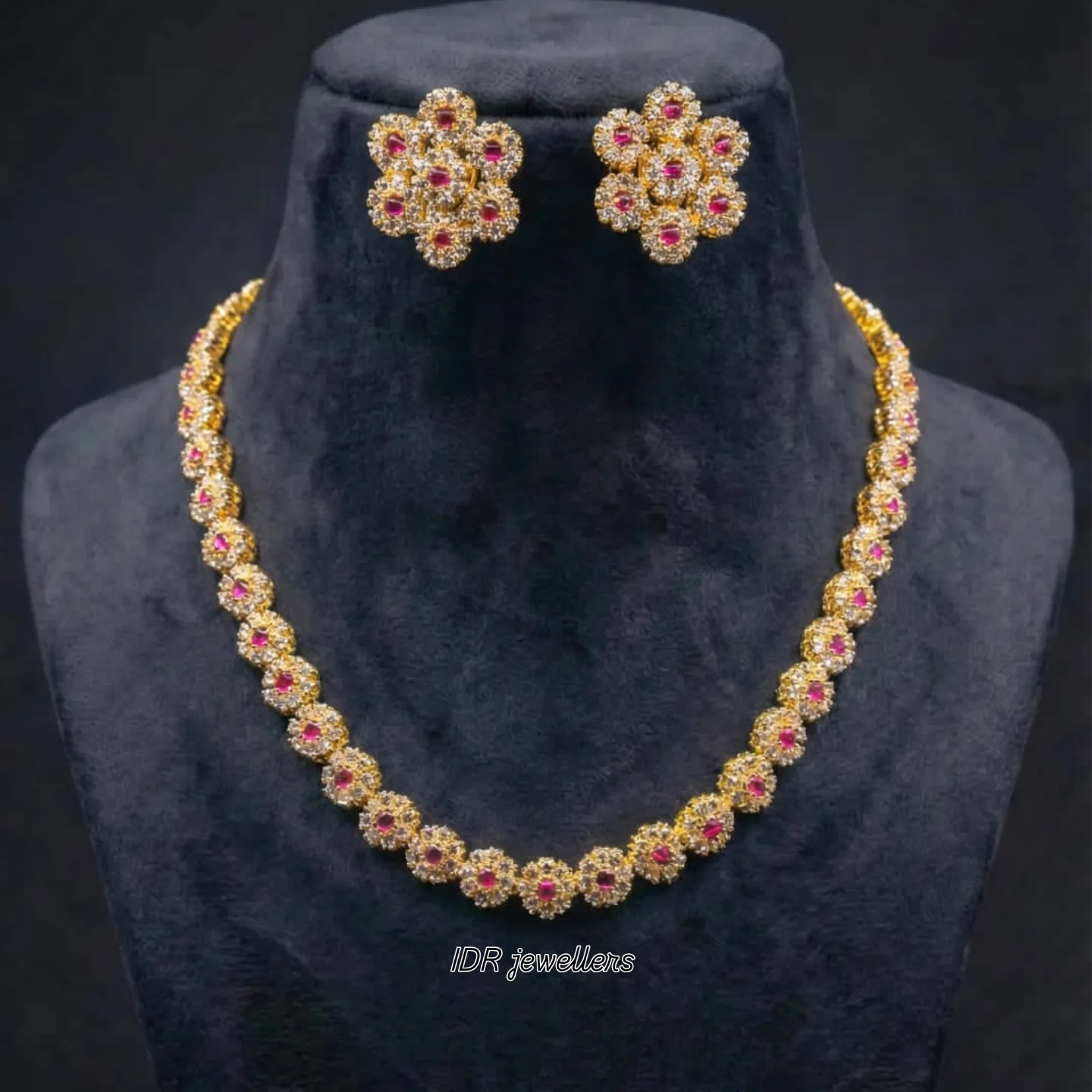 The Ruby Blossom Royale necklace and earrings set is a timeless expression of elegance and fine craftsmanship. Made from 925 sterling silver, this exquisite set features a continuous chain of delicately sculpted floral motifs, each centered with radiant ruby-toned stones and surrounded by shimmering accents. The matching floral stud earrings perfectly complement the necklace, creating a harmonious and luxurious look.