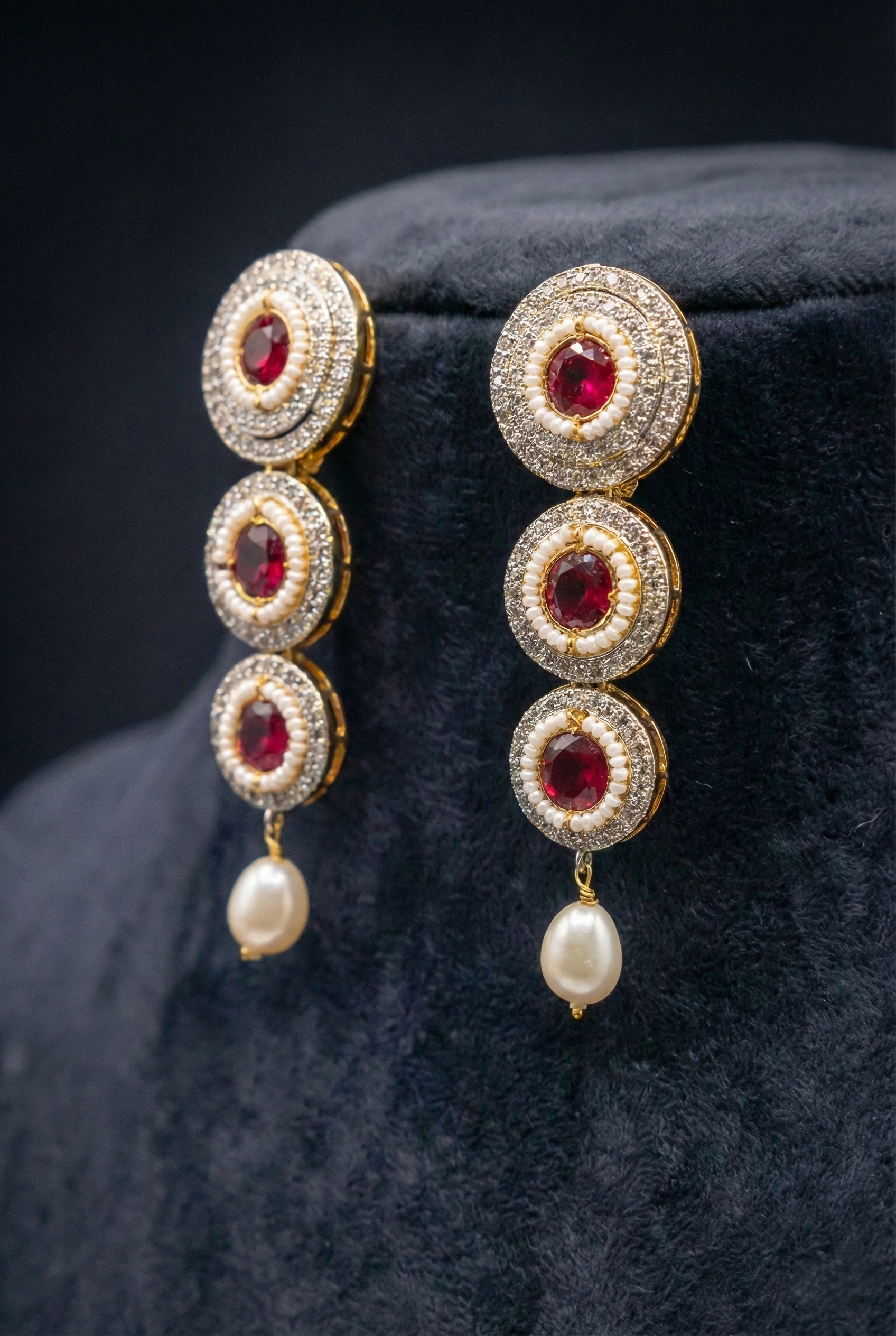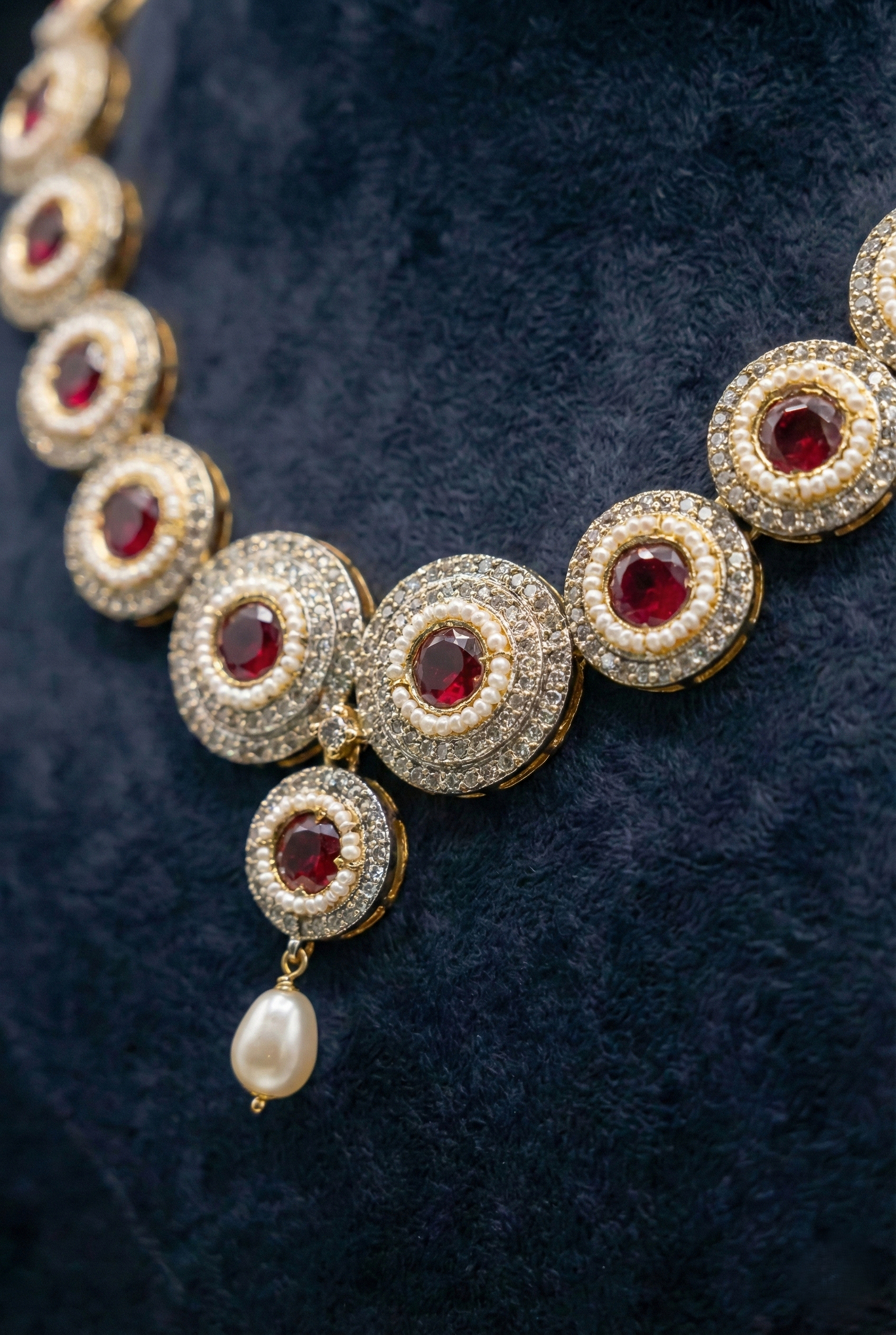 Each medallion is centered with a brilliant pigeon-blood red stone, meticulously framed by a delicate halo of hand-set seed pearls and a shimmering outer border of micro-stones. The set is complemented by stunning triple-tier drop earrings that mirror the necklace’s design, finished with elegant pearl droplets for a touch of timeless grace.