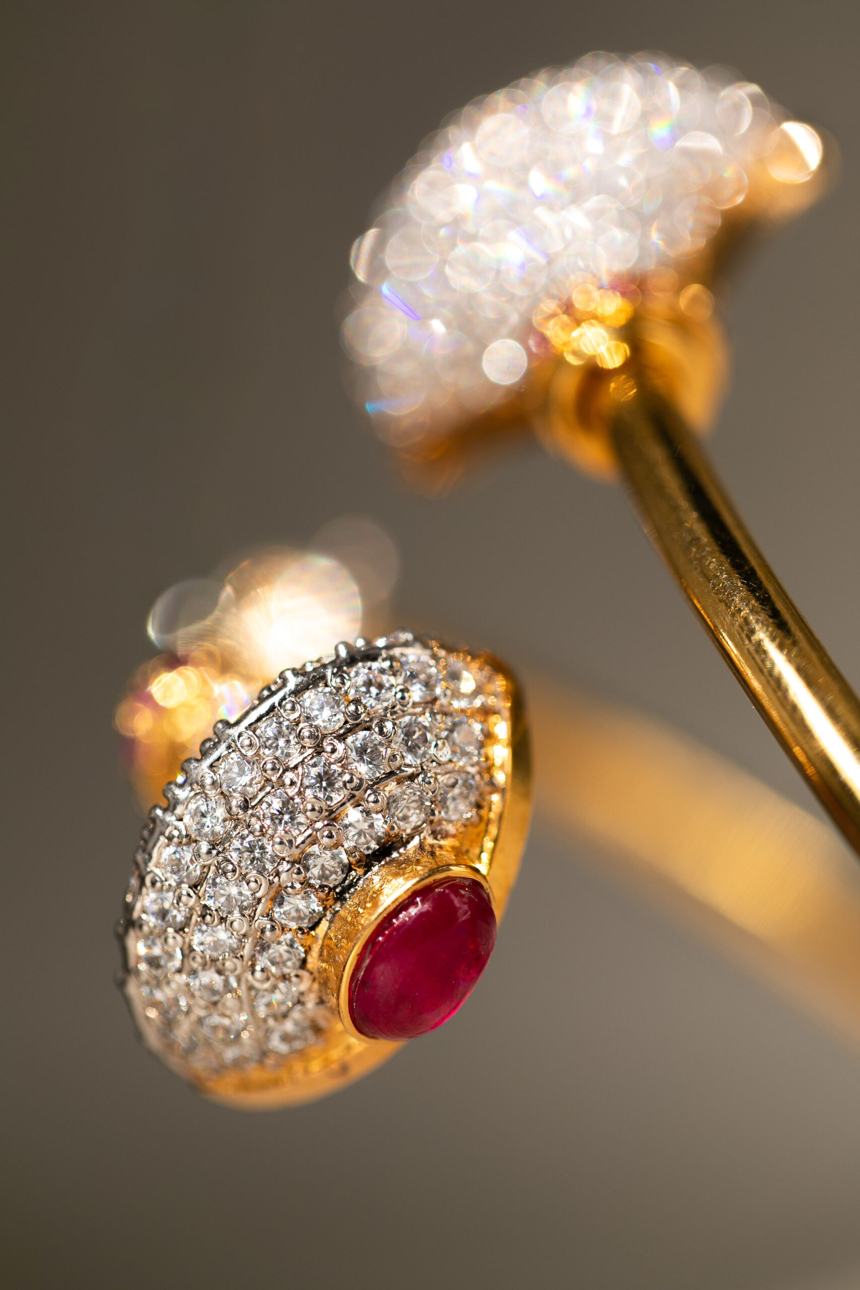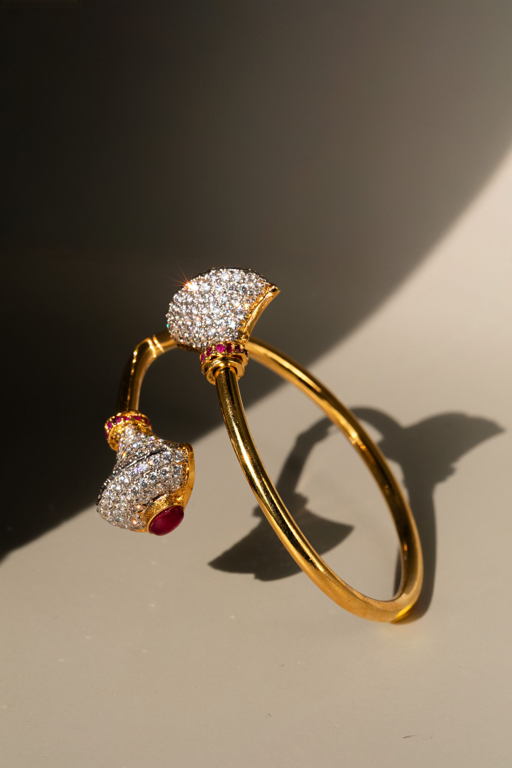 A true masterpiece of craftsmanship, the Royal Fan Pavé Bangle combines architectural elegance with opulent sparkle. This open-cuff bypass design features two stunning fan-shaped terminals, meticulously hand-set with shimmering pavé stones and accented by deep, crimson-red ruby-style stones. It’s a bold statement of luxury designed for the modern woman who appreciates classic glamour.